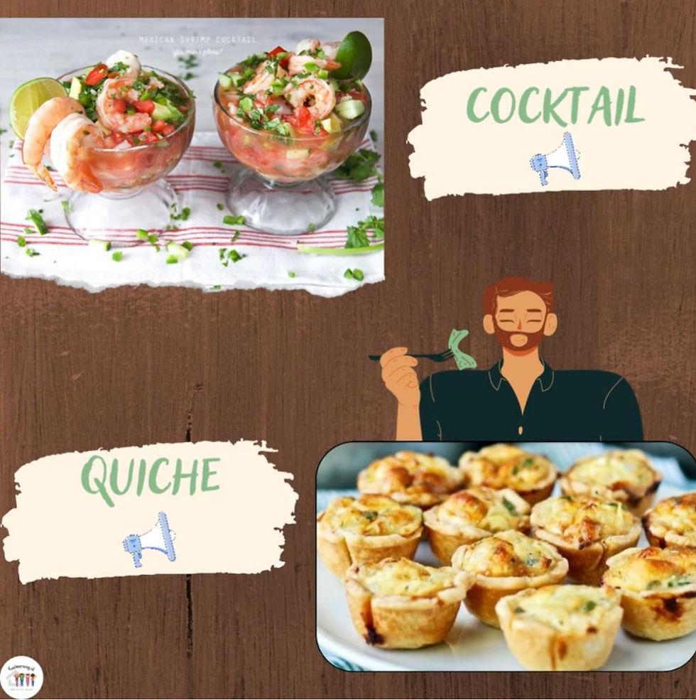 Beberapa gambar di bawah ini adalah contoh 'Appetizer' yang biasanya di nikmati oleh orang-orang barat sebagai sajian pembuka dan memunculkan nafsu makan. 'Appetizer' biasanya memiliki ukuran yang kecil, tampilan yang menarik, dan memiliki beberapa jenis, ada yang di sajikan secara dingin (cold) dan ada juga yang di sajikan secara panas (hot). Ada juga gambar contoh 'Main Course’ yang biasanya di nikmati oleh orang-orang barat sebagai sajian utama dan ‘Dessert’ sebagai sajian penutup.